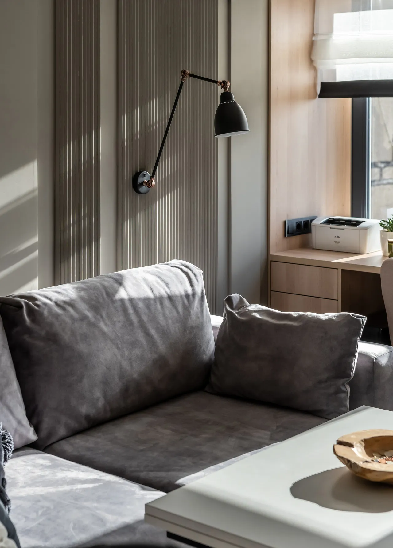 Одной из ключевых задач стало визуальное увеличение высоты потолков в гостиной и коридоре. Дизайнеры использовали вертикальные линии декоративных панелей, которые, благодаря своему ритму, ширине и расстоянию между элементами, создали эффект дополнительной высоты. Это решение не только добавило воздуха помещению, но и стало стильным акцентом интерьера .